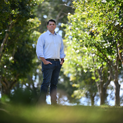 Rio Tinto Chief Decarbonisation Officer Jonathon McCarthy flanked by Pongamia trees. The Pongamia pilot will explore the potential of Pongamia seed oil as a feedstock for renewable diesel, a cleaner alternative to traditional fossil fuels.